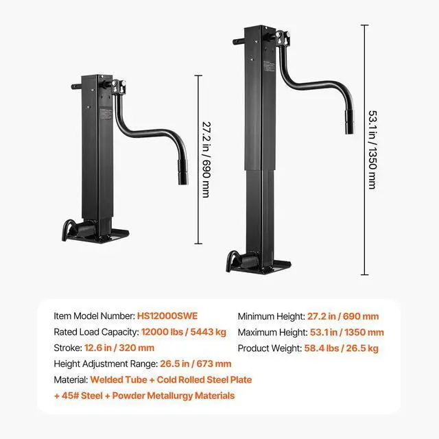 Stroke: 12.6 in / 320 mm,Height Adjustment Range: 26 in / 660 mm,Rated Load Capacity: 12000 lbs / 5443 kg,Item Model Number: HS12000SWE,Product Weight: 58.4 lbs / 26.5 kg,Maximum Height: 53.1 in / 1350 mm,Material: Welded Tube + Cold Rolled Steel Plate + 45# Steel + Powder Metallurgy Materials,Minimum Height: 27.2 in / 690 mm