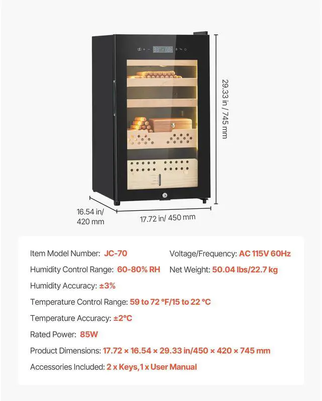 Voltage/Frequency: AC 115V 60Hz,Operating Humidity: 20%-95%,Temperature Accuracy: ±35.6/2,Product Type: With Humidification Function, Bottom Water Tank,Ambient Temperature Range: 0 to 89.6/1°C to 32°C,Humidity Accuracy: ±3%,Item Model Number: JC-70,Humidity Control Range: 60-80% RH,Rated Power: 85W,Temperature Control Range: 59 to 72 /15 to 22 ,Product Dimensions: 17.72 x 16.54 x 29.33 in/450 x 420 x 745 mm,Net Weight: 51.37 lbs/23.3 kg