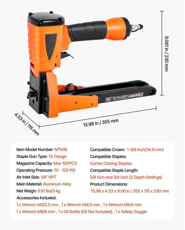 Operating Pressure: 70 - 120 PSI,Staple Gun Type: 13-Gauge,Compatible Staple Length: 5/8 inch and 3/4 inch (2 Depth Settings),Magazine Capacity: Max 100PCS,Item Model Number: MTA18,Compatible Crown Width: 1-3/8 inch,Air Inlet Size: 1/4" NPT,Compatible Staples: Carton Closing Staples,Product Dimensions: 13.98 x 4.53 x 9.06 inch / 355 x 115 x 230 mm,Net Weight: 6.61 lbs / 3 kg,Main Material: Aluminum Alloy
