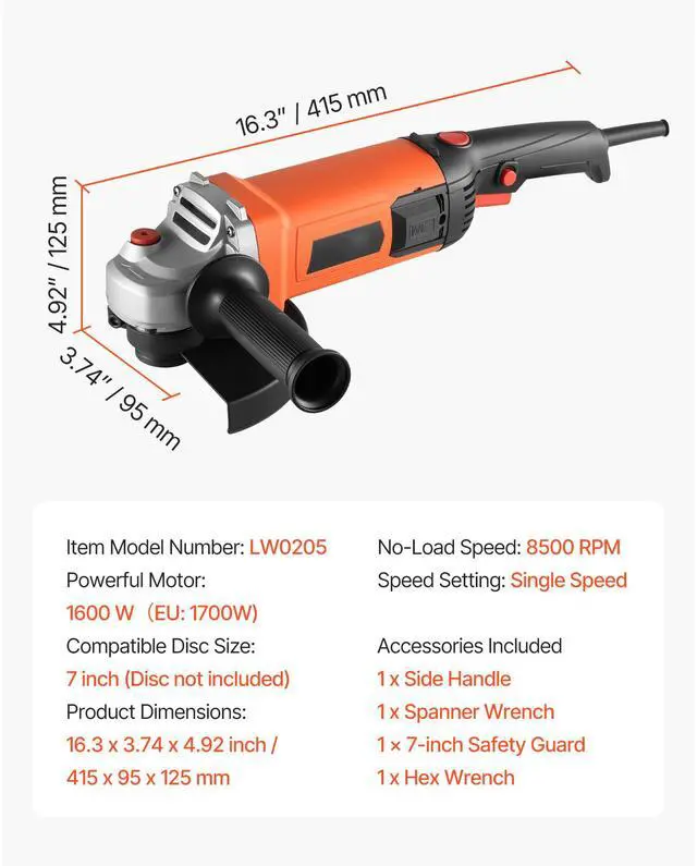 Powerful Motor: 1600 W,Compatible Disc Size: 7 inch (Disc not included),Speed Setting: Single Speed,Item Model Number: LW0205,No-Load Speed: 8500 RPM,Product Dimensions: 16.3 x 3.74 x 4.92 inch / 415 x 95 x 125 mm,Net Weight: 9.26 lbs / 4.2 kg