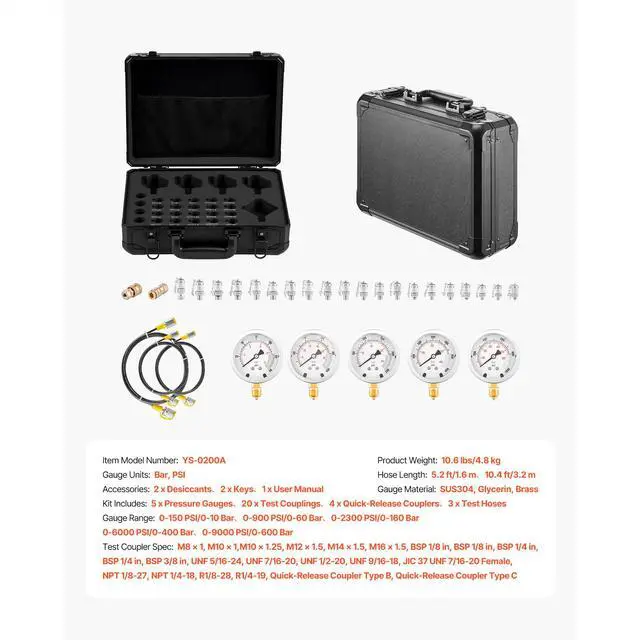 Hose Length: 5.2 ft/1.6 m; 10.4 ft/3.2 m,Item Model Number: YS-0200A,Product Weight: 10.6 lbs/4.8 kg,Gauge Units: Bar, PSI,Gauge Material: SUS304, Glycerin, Brass