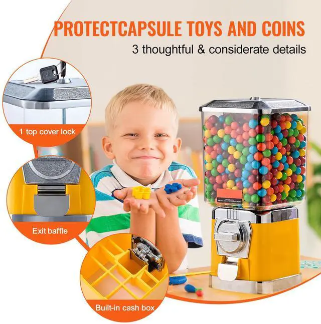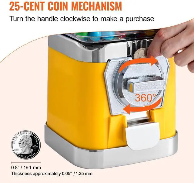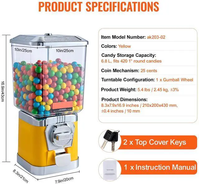 Colors: Yellow,Item Model Number: ak203-02,Coin Mechanism: 25 Cents,Product Weight: 5.4 lbs / 2.45 kg, ±3%,Candy Storage Capacity: 6.8 L, fits 420 1" round candies,Product Dimensions: 8.3x7.9x16.9 inches / 210x200x430 mm, ±0.4 inches / 10 mm