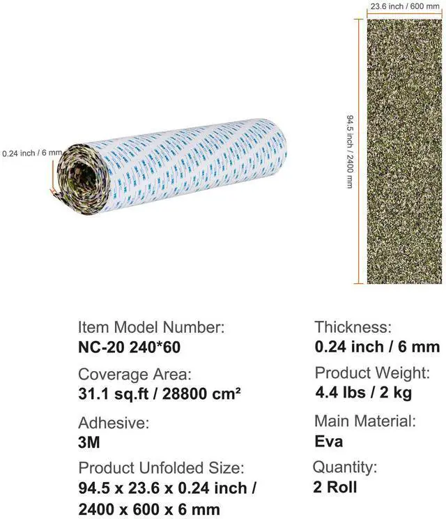 Operating Temperature: -4~122/-20 ~ 50,Product Unfolded Size: 94.5 x 23.6 x 0.24 inch / 2400 x 600 x 6 mm,Item Model Number: NC-20 240*60,Product Weight: 4.4 lbs/2 kg,Quantity: 2 Rolls,Coverage Area: 31.1 sq.ft/28800 cm²,Adhesive: 3M,Main Material: Eva