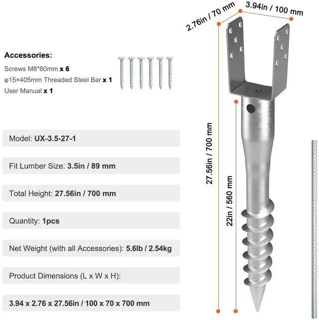 Model: UX-3.5-27-1,Fit Lumber Size: 3.5in / 89 mm,Quantity: 1pcs,Product Dimensions (L x W x H): 3.94x2.76x27.56in / 100x70x700 mm,Net Weight (with Accessories): 5.6lb / 2.54kg,Nail Length: 22in / 560mm ±10mm,Material Thickness: Nail Inner Wall: 2.2mm, Column Fixing Plate: 3mm, ±0.2,Main Material: Steel,Total Height: 34in / 864 mm