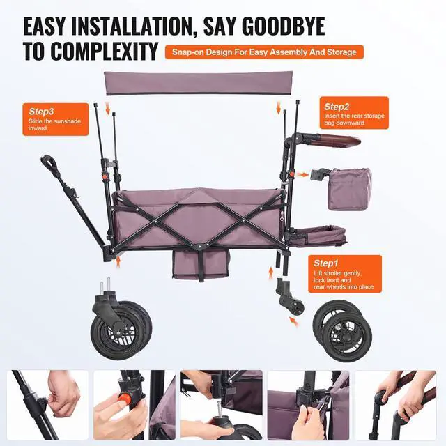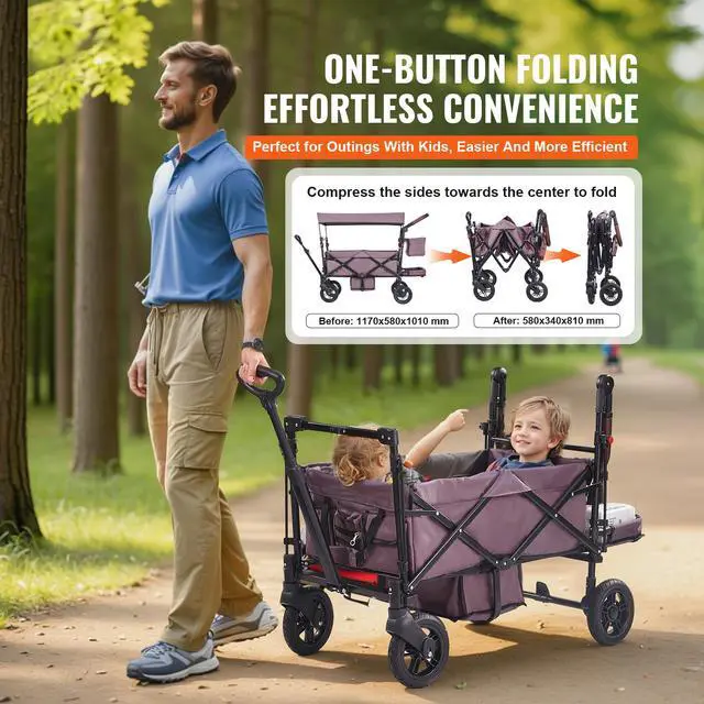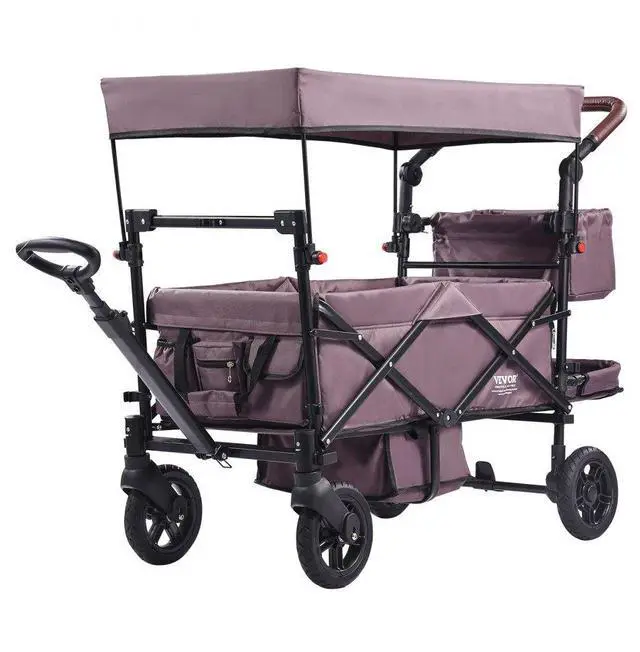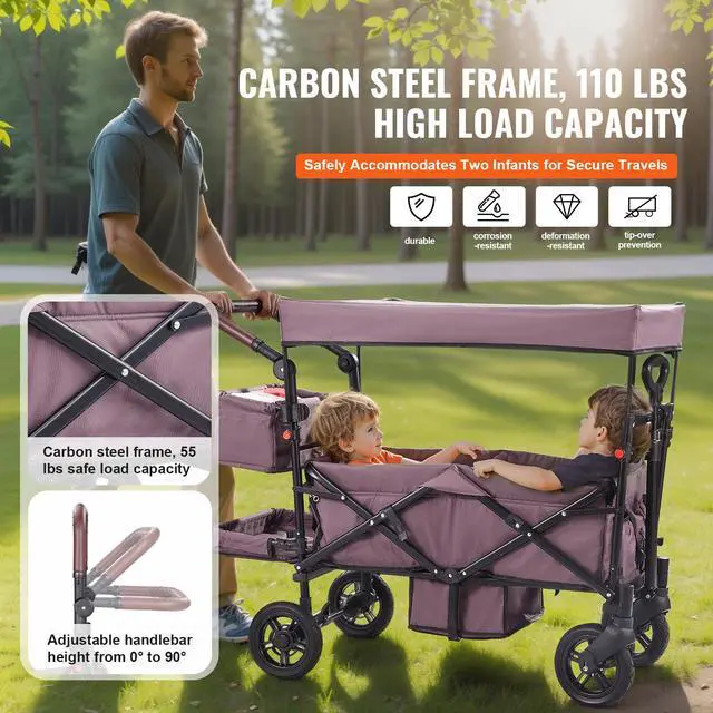 VEVOR Wagon Stroller for 2 Kids, Push Pull Quad Collapsible Stroller with Adjustable Handle, Encircling Harness Removable Canopy,4 Wheels w/ Brakes,Mutifunction Tandem Stroller for Camping Dark Purple