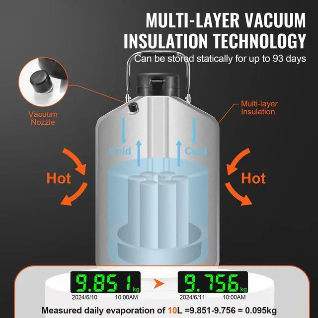 Daily Evaporation: 90~110 g/D,Capacity: 2.64 gal / 10L,Hole Diameter of Mouth: 1.96 in / 5 cm,Item Model Number: YDS-10,Canisters Quantity: 6pcs(2 without holes&4 with holes),Product Dimensions: 12.0 x 12.0 x 22.0 in / 304 x 304 x 560 mm,Net Weight: 15.2 lbs / 6.9 kg,Outer Dimensions of Container: 12.0 x 25.4 in / 30.4 x 64.5 cm,Static Preservation Time: 84~93 days
