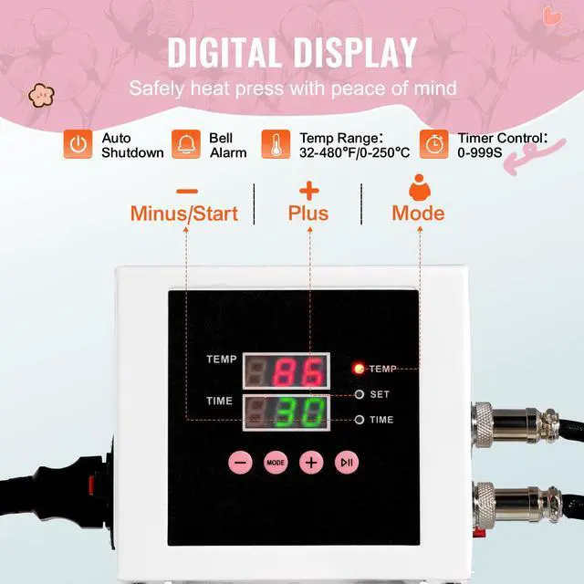 Heat Plate Size: 15 x 15 in / 380 x 380 mm,Main Materials: Aluminum Alloy, Sheet Metal,Net Weight (including all accessories): 39.2 lbs / 17.8 kg,Time Range: 0-999s,Color: Pink,Item Model Number: SJY-H15152M,Temperature Range: 32-480/0-250,Power: 1400W(US) / 1250W(AU/EU)