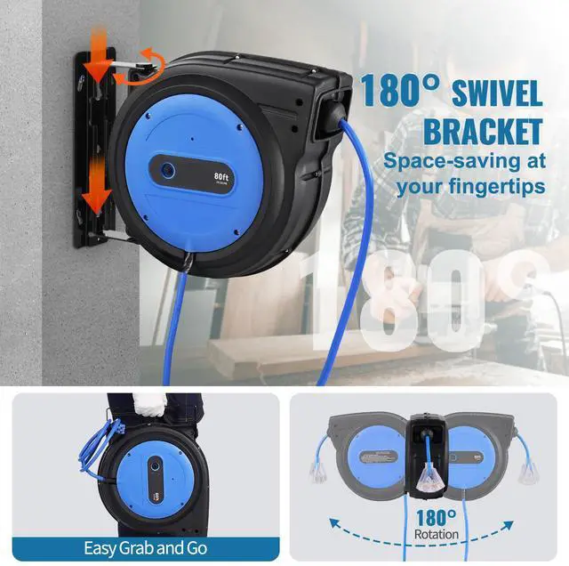 VEVOR Retractable Extension Cord Reel Power Cord Reel 80FT 12AWG/3C SJTOW