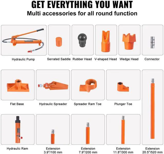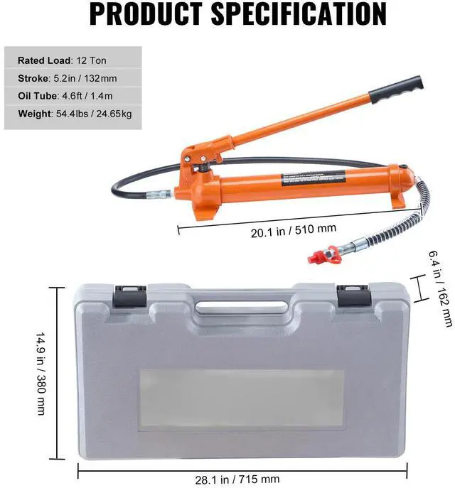 Stroke: 5.2 in/132 mm,Oil Tube: 4.6 ft/1.4 m,Item Model Number: 12T maintenance jack,Weight: 54.4 lbs/24.65 kg,Rated Load: 12 Ton