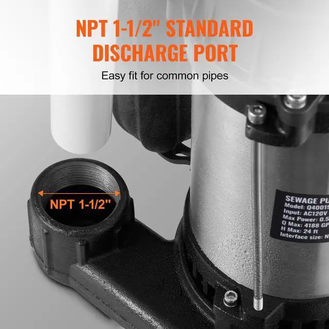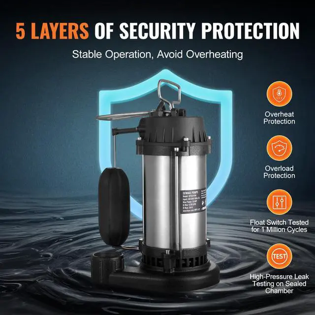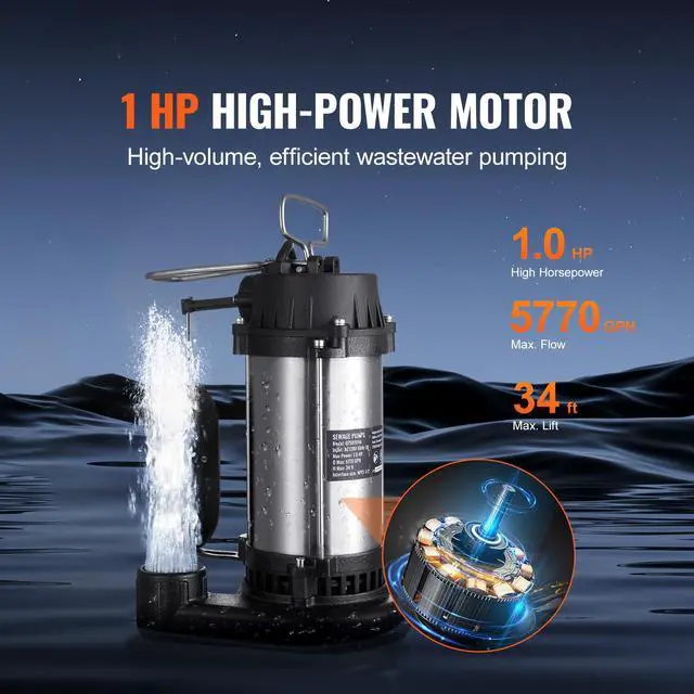 VEVOR Submersible Sewage Pump Water Pump 1HP 5770GPH 34 ft Lift for Basement
