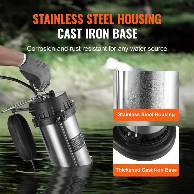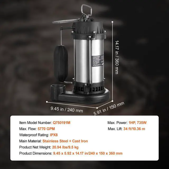 Max. Flow: 5770 GPM,Waterproof Rating: IPX8,Item Model Number: Q750191M,Max. Power: 1 HP, 735W,Max. Lift: 34 ft/10.36 m,Product Net Weight: 20.94 lbs/9.5 kg,Product Dimensions: 9.45 x 5.91 x 14.17 in/240 x 150 x 360 mm,Main Material: Stainless Steel + Cast Iron