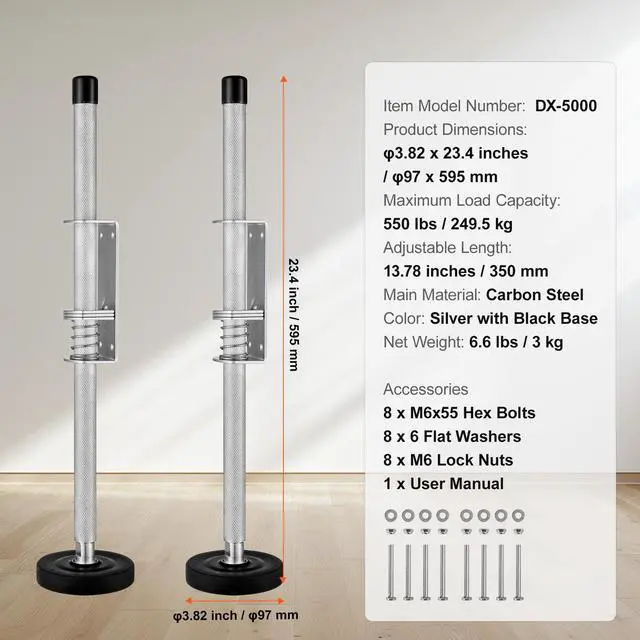 Maximum Length: 23.4 inches / 595 mm,Color: Silver with Black Base,Item Model Number: DX-5000,Maximum Load Capacity: 550 lbs / 249.5 kg,Product Dimensions: 3.82 x 23.4 inches / 97 x 595 mm,Net Weight: 6.6 lbs / 3 kg,Adjustable Length: 13.78 inches / 350 mm,Main Material: Carbon Steel