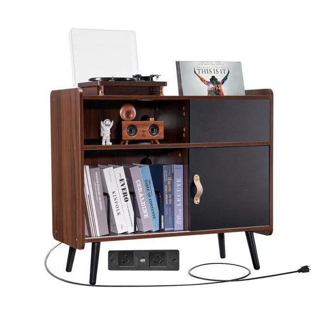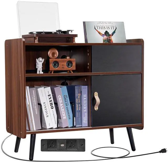 VEVOR Record Player Stand with Power Outlet, Turntable Stand Holds Up to 350 Albums, Record Player Table with Vintage Vinyl Record Storage for Living Room, Bedroom, Brown