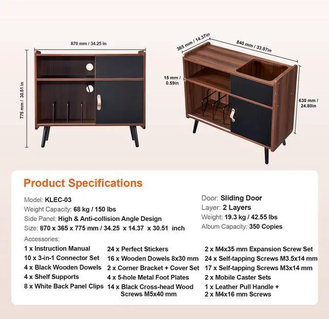 Weight Capacity: 68 kg / 150 lbs,Size: 870 x 365 x 775 mm / 34.25 x 14.37 x 30.51 inch,Side Panel: High & Anti-collision Angle Design,Item Model Number: KLEC-03,Album Capacity: 350 Copies,Layer: 2 Layers,Door: Sliding Door,Weight: 19.3 kg / 42.55 lbs