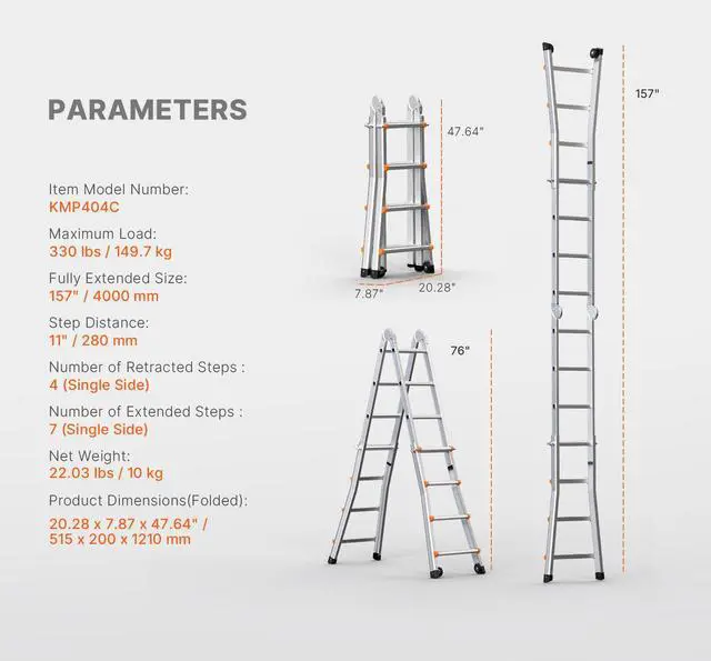 Number of Retracted Steps (Single Side): 4,Number of Extended Steps (Single Side): 7,Maximum Load: 330 lbs / 149.7 kg,Fully Extended Size: 157" / 4000 mm,Step Distance: 11" / 280 mm,Item Model Number: KMP404C,Product Dimensions (Folded): 20.28 x 7.87 x 47.64" / 515 x 200 x 1210 mm,Net Weight: 22.03 lbs / 10 kg