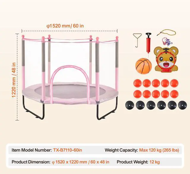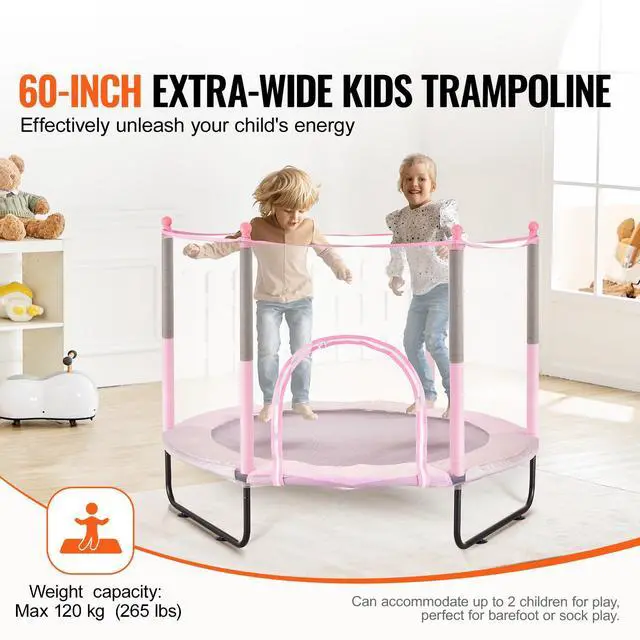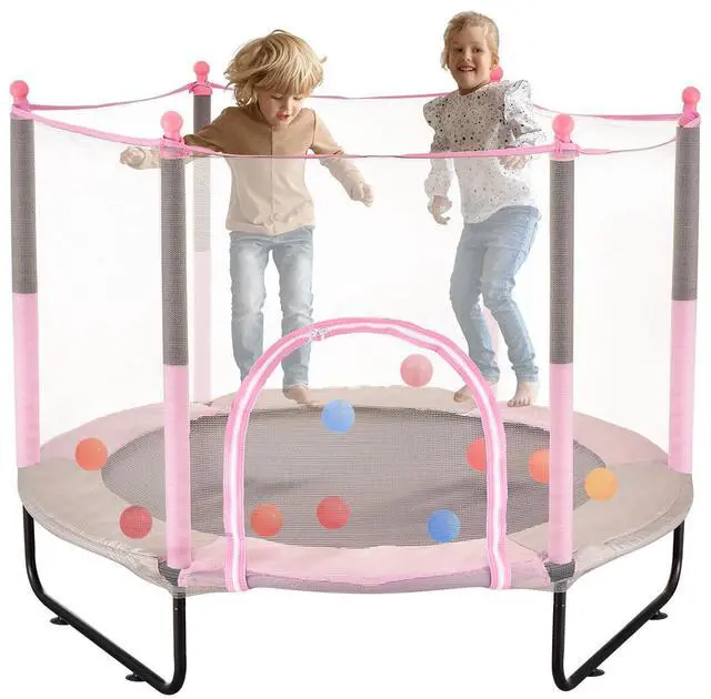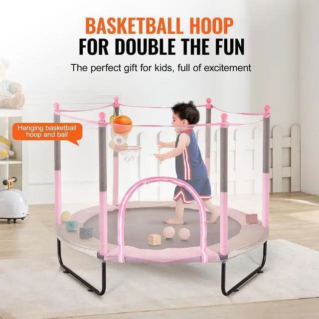 60" Kids Trampoline, 5FT Indoor Outdoor Trampoline, Mini Toddler Recreational Trampolinewith Safety Enclosure Net and Basketball Hoop, Birthday Gifts Christmas Toys for 3+ Years Children, Pink