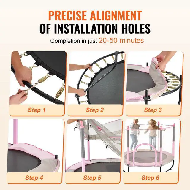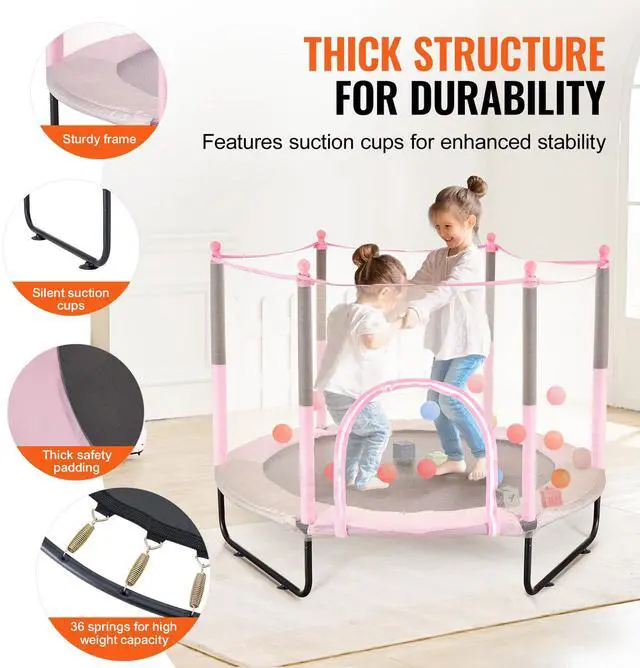 • Upgraded Jumping Mat: The jumping mat is integrated with the safety skirt, featuring a robust design for increased protection. With 36 springs supporting a maximum weight of 120 kg (265 lbs), our indoor outdoor toddler trampoline ensures safety during every jump. Six safety poles, a 360° enclosure net, and a U-shaped zipper provide comprehensive protection for your child.