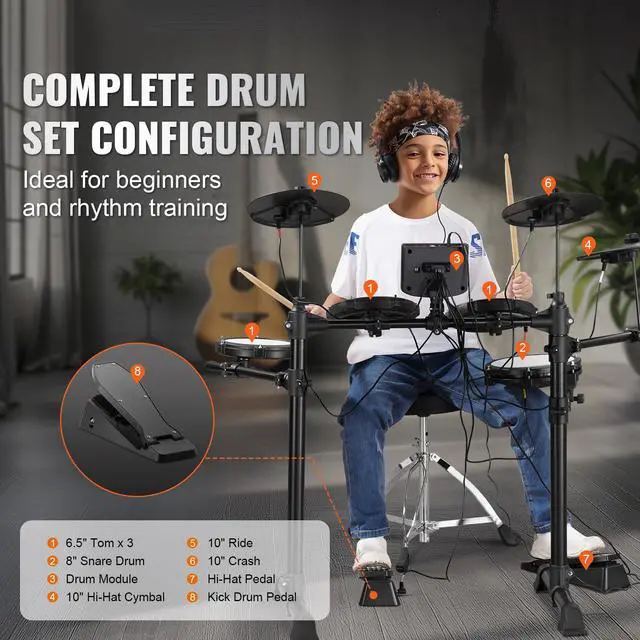 • Complete Drum Kit: This electric drum set includes three 6.5" toms, one 8" snare, and three 10" cymbals, giving you an entire striking area. The drum module, sticks, pedals, headphones, and an adjustable throne are included. It's ideal for beginners and rhythm training!