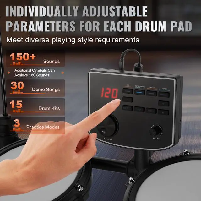 • Diverse Sound Options: Choose from 150+ sounds (expandable to 180 with extra cymbals) and 15 drum kits that cover a range of percussion styles. With 30 demo songs and 3 practice modes included, you can develop your drumming skills - making this electronic drum set a fantastic choice for beginners!