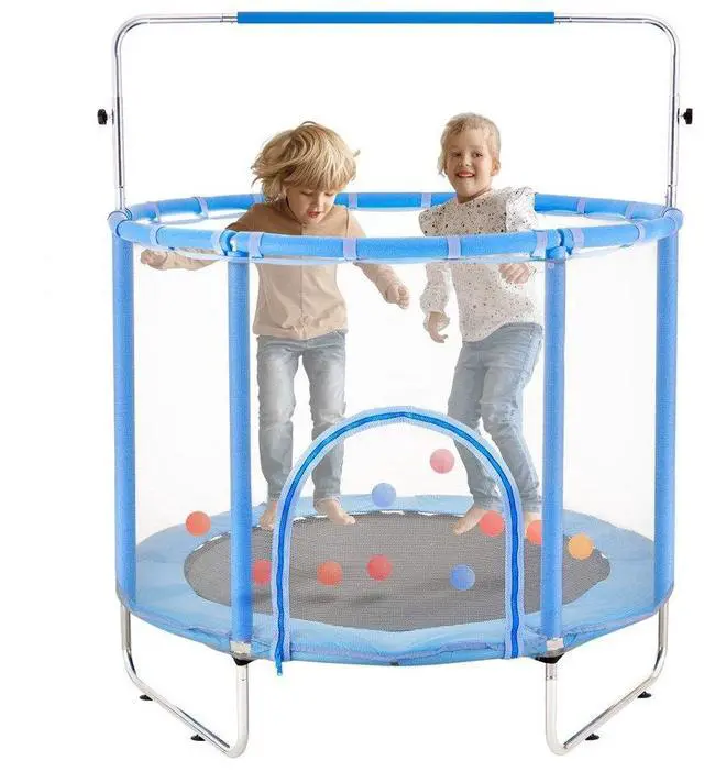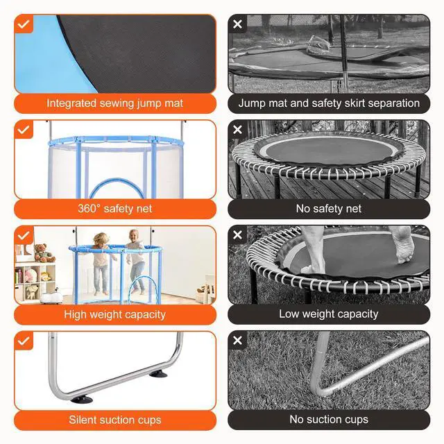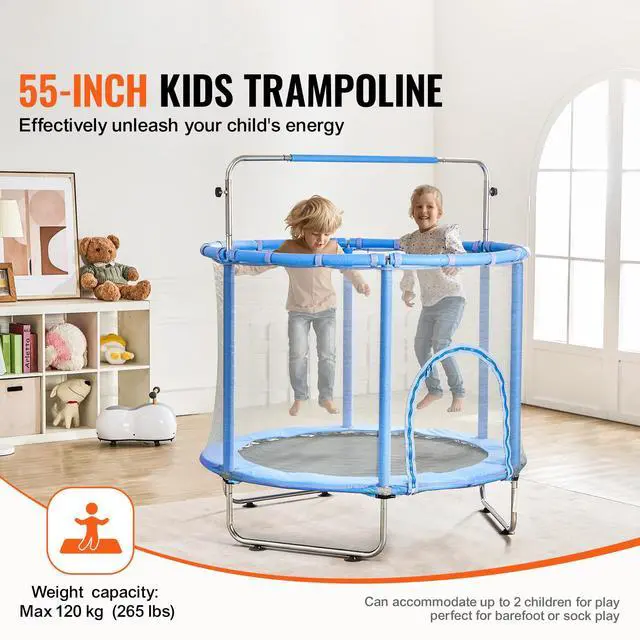 Designed for Kids: Unleash children's natural energy with the best family activity game. The 55-inch kids' trampoline with safety net is designed specifically for children, accommodating two jumpers at once. It provides kids with more exercise at home, enhancing their strength and endurance while promoting fun activities that improve flexibility and coordination.