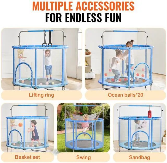 Multiple Fun Options: Our mini baby toddler trampoline is suitable for both indoor and outdoor use, with sizes that fit perfectly. The trampoline accessories include rings, swings, sandbags, ocean balls, and a basketball set, providing your child with more fun while jumping