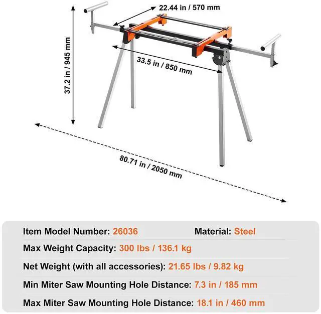 Max Weight Capacity: 300 lbs / 136.1 kg,Item Model Number: 26036,Material: Steel,Minimum Miter Saw Mounting Hole Distance: 7.3 in / 185 mm,Maximum Miter Saw Mounting Hole Distance: 18.1 in / 460 mm,Net Weight (with all accessories): 22.40 lbs / 10.16 kg