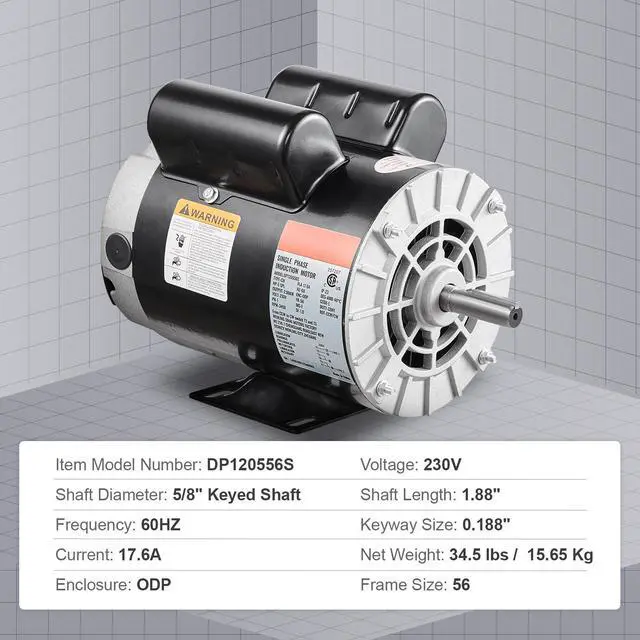 Shaft Length: 1.88",SF: 1.0,Voltage: 230V,Item Model Number: DP120556S,Frequency: 60HZ,Shaft Diameter: 5/8" Keyed Shaft,Enclosure: ODP,Current: 17.6A,Net Weight: 34.5 lbs / 15.65 Kg,Keyway Size: 0.188",Rotation Speed: 3450rpm,Frame Size: 56