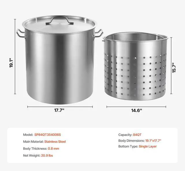 Capacity: 84 QT / 79.5 L,Item Model Number: SP84QT454906S,Bottom Type: Single Layer,Inner Body Dimension: 17.7" x 19.1" / 450 x 485 mm,Body Thickness: 0.8 mm,Net Weight: 20.9 lbs / 9.5 kg,Main Material: Stainless Steel