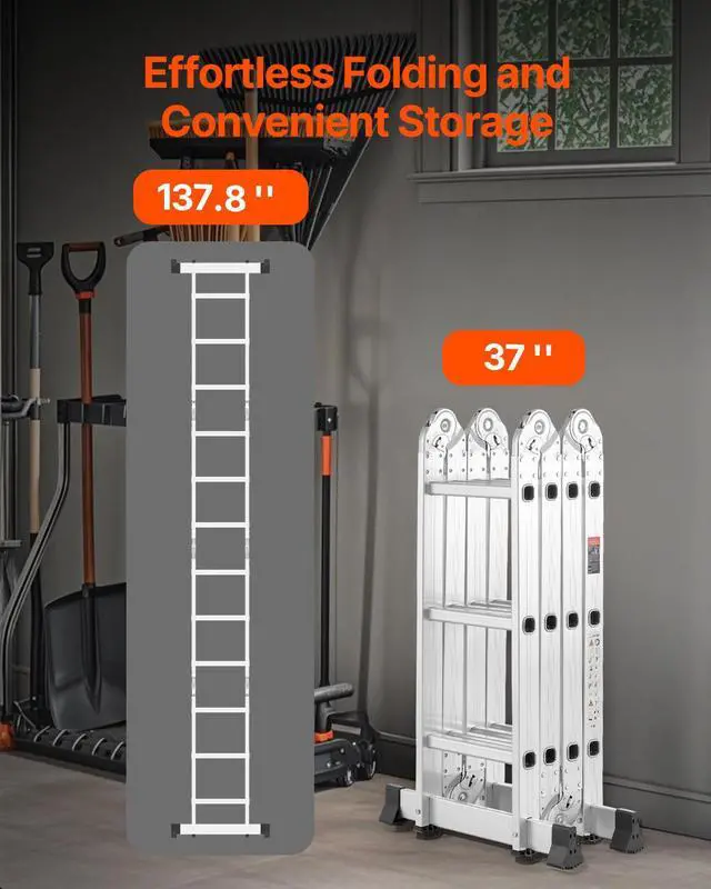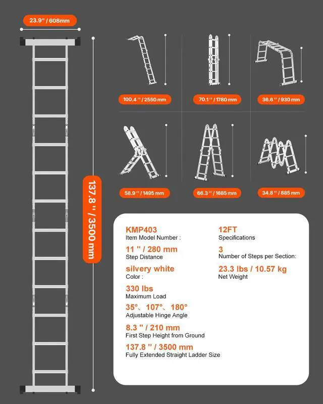 Specifications : 12 ft / 3.7m,Max. Load in Platform Position: 330 lbs / 149.7 kg,Number of Sections: 4 pcs,Max. Load in A-Frame Position: 330 lbs / 149.7 kg,Step Distance: 11 '' / 280 mm,Item Model Number: KMP403,Item Size(Folded without balance bar): 13.6''x10.8''x37'' / 345x275x940 mm,Fully Extended Straight Ladder Size: 137.8 '' / 3500 mm,Item Size(A-frame with balance bar): 47''x23.9''x66.3'' / 1195x608 x1685 mm,Max. Load in Straight Position: 330 lbs / 149.7 kg,Net Weight: 23.3 lbs / 10.57 kg