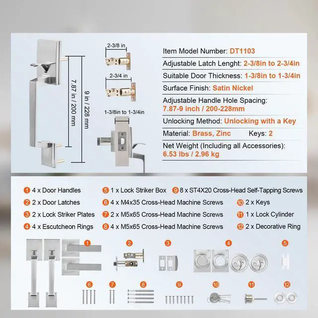 Keys: 2,Item Model Number: DT1103,Product Weight: 6.53 lbs / 2.96 kg,Surface Finish: Satin Nickel,Material: Brass, Zinc