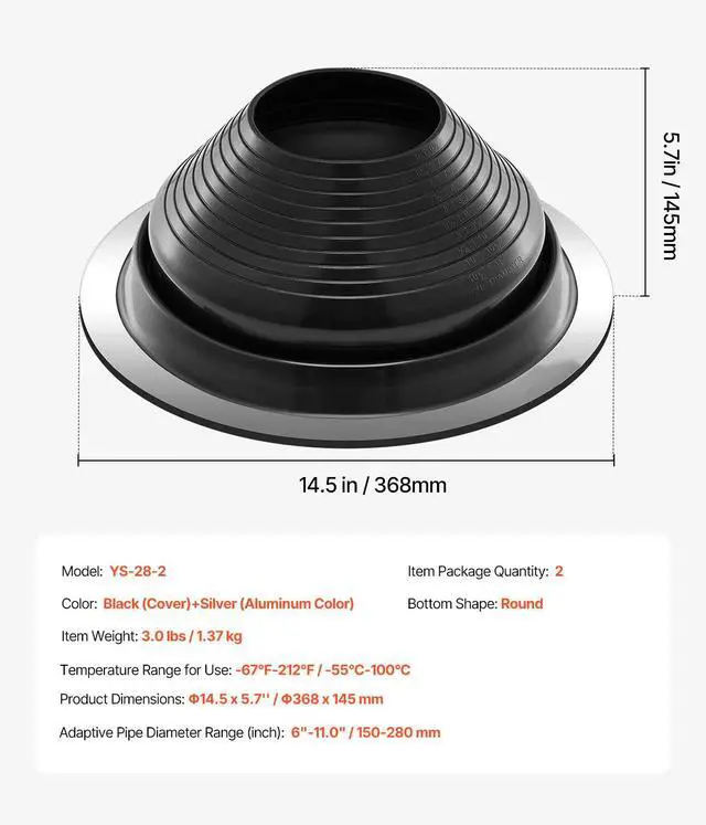 Item Package Quantity: 2,Temperature Range for Use: -67-212 / -55-100,Color: Black (Cover)+Silver (Aluminum Color),Item Model Number: YS-28-2,Bottom Shape: Round,Product Dimensions: 14.5 x 5.7'' / 368 x 145 mm,Adaptive Pipe Diameter Range (inch): 6"-11.0" / 150-280 mm,Item Weight: 3.0 lbs / 1.37 kg