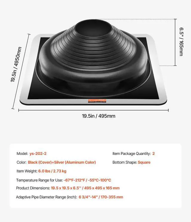Item Package Quantity: 2,Temperature Range for Use: -67-212 / -55-100,Color: Black (Cover)+Silver (Aluminum Color),Item Model Number: ys-202-2,Bottom Shape: Square,Product Dimensions: 19.5 x 19.5 x 6.5'' / 495 x 495 x 165 mm,Adaptive Pipe Diameter Range (inch): 6 3/4"-14" / 170-355 mm,Item Weight: 6.0 lbs / 2.73 kg