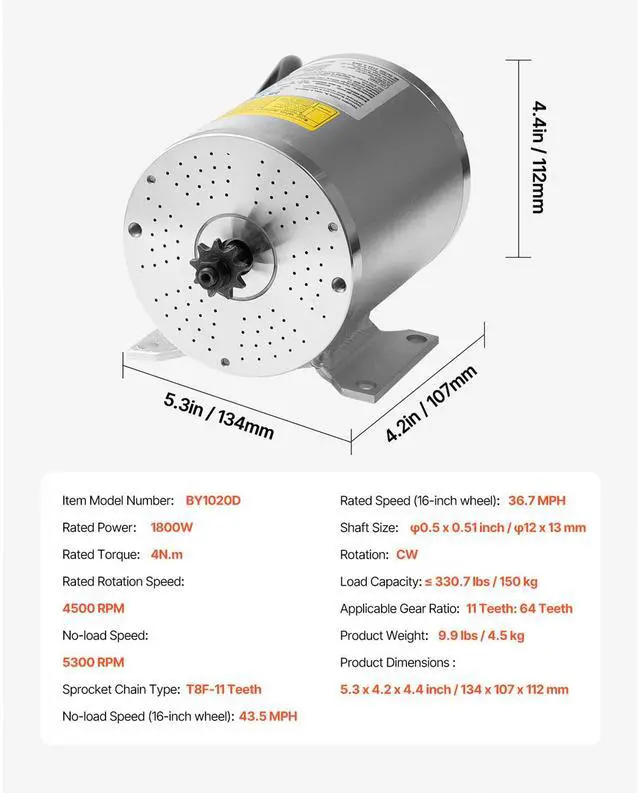 No-load Rotation Speed: 5300 RPM,Load Capacity: 330.7 lbs / 150 kg,Rated Rotation Speed: 4500 RPM,Item Model Number: BY1020D,Product Weight: 9.9 lbs / 4.5 kg,Rated Power: 1800W,Product Dimensions: 5.3 x 4.2 x 4.4 inch / 134 x 107 x 112 mm,Rated Torque: 4N·m,Rotation: CW