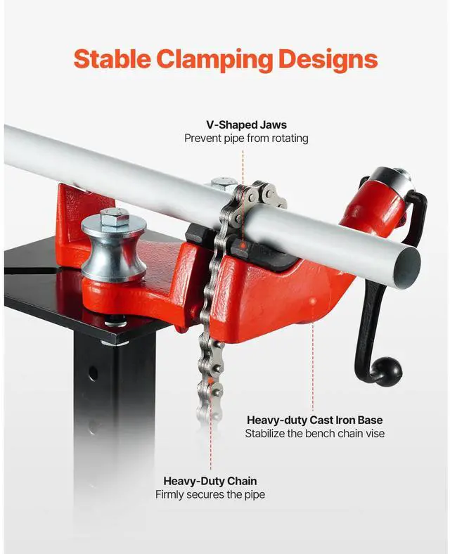 V-Shaped Jaws: Replaceable,Detachable Bending Dies: Yes,Applicable Pipe Size: 1/8 - 5 inch,Item Model Number: RG1204S5,Mounting Plate Size: 7-7/8 x 7-7/8 in / 200 x 200 mm,Product Dimensions: 9.8 x 9.3 x 4.1 in / 250 x 235 x 105 mm,Chain Length: 26.0 in / 660 mm,Net Weight: 32.2 lbs / 14.6 kg,Mounting Hole Size: 5/8 x 3.3 in / 15.8 x 85 mm,Main Material: Cast Iron,Hitch Receiver: 2 x 2 in / 50 x 50 mm