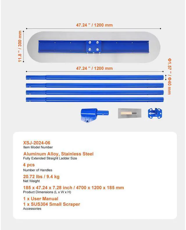 Number of Handles: 4 pcs,Item Model Number: XSJ-2024-06,Product Dimensions (L x W x H): 185 x 47.24 x 7.28 inch / 4700 x 1200 x 185 mm,Net Weight: 20.72 lbs / 9.4 kg,Main Material: Aluminum Alloy, Stainless Steel