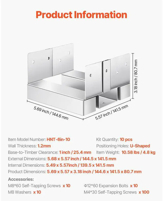 Base-to-Timber Clearance: 1 inch / 25.4 mm,Kit Quantity: 10 pcs,External Dimensions: 5.68 x 5.57 inch / 144.5 x 141.5 mm,Positioning Holes: U-Shaped,Item Model Number: HNT-6in-10,Wall Thickness: 1.2mm,Product Dimensions: 5.69 x 5.57 x 3.18 inch / 144.6 x 141.5 x 80.7 mm,Internal Dimensions: 5.49 x 5.57inch / 139.5 x 141.5 mm,Net Weight: 10.58 lbs / 4.8 kg