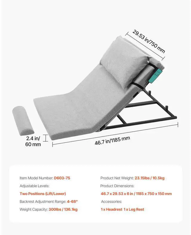 Adjustable Levels: Two Positions (Lift/Lower),Backrest Adjustment Range: 4-68°,Weight Capacity: 300 lbs / 136.1 kg,Item Model Number: D603-75,Product Net Weight: 23.15 lbs / 10.5 kg,Product Dimensions: 46.7 x 29.53 x 6 in / 1185 x 750 x 150 mm