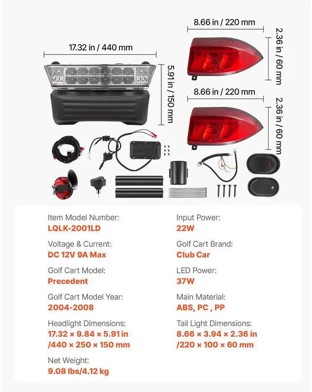 LED Power: 37W,Headlight Dimensions: 17.32 x 9.84 x 5.91 in/440 x 250 x 150 mm,Golf Cart Model: Precedent,Golf Cart Model Year: 2004-2008,Input Power: 22W,Voltage & Current: DC12V 9A Max,Item Model Number: LQLK-2001LD,Net Weight: 9.08 lbs/4.12 kg ,Golf Cart Brand: Club Car,Main Material: ABS, PC , PP,Tail Light Dimensions: 8.66 x 3.94 x 2.36 in/220 x 100 x 60 mm
