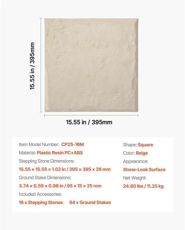 Shape: Square,Stepping Stone Dimensions: 15.55 × 15.55 × 1.02 in / 395 × 395 × 26 mm,Color: Beige,Ground Stake Dimensions: 3.74 × 0.59 × 0.98 in / 95 × 15 × 25 mm,Item Model Number: CP25-16M,Material: Plastic Resin PC+ABS,Appearance: Stone-Look Surface,Net Weight: 24.80 lbs / 11.25 kg