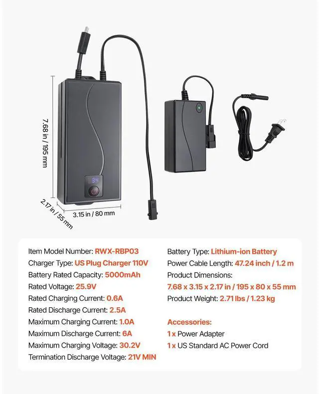 Maximum Charging Voltage: 30.2V,Maximum Charging Current: 1.0A,Battery Rated Capacity: 5000mAh,Charger Type: US Plug Charger 110V,Maximum Discharge Current: 6A,Product Dimensions: 7.68 x 3.15 x 2.17 inch / 195 x 80 x 55 mm,Rated Charging Current: 0.6A,Battery Type: Lithium-ion Battery,Rated Voltage: 25.9V,Power Cable Length: 47.24 inch / 1.2 m,Termination Discharge Voltage: 21V MIN,Item Model Number: RWX-RBP03,Product Weight: 2.71 lbs / 1.23 kg,Rated Discharge Current: 2.5A