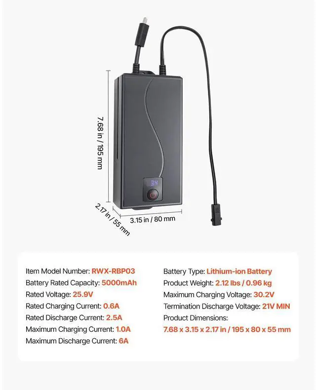 Maximum Charging Voltage: 30.2V,Maximum Charging Current: 1.0A,Termination Discharge Voltage: 21V MIN,Item Model Number: RWX-RBP03,Battery Rated Capacity: 5000mAh,Product Weight: 2.12 lbs / 0.96 kg,Maximum Discharge Current: 6A,Product Dimensions: 7.68 x 3.15 x 2.17 inch / 195 x 80 x 55 mm,Rated Charging Current: 0.6A,Rated Discharge Current: 2.5A,Battery Type: Lithium-ion Battery,Rated Voltage: 25.9V