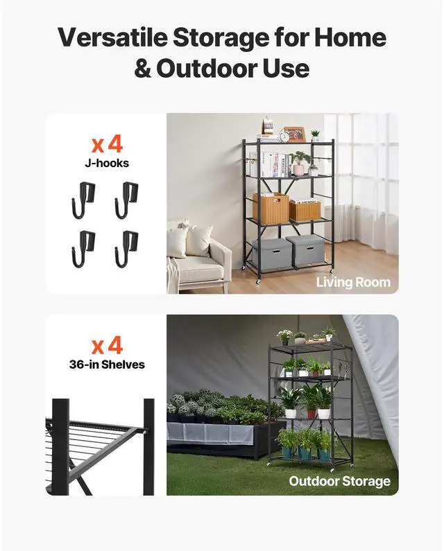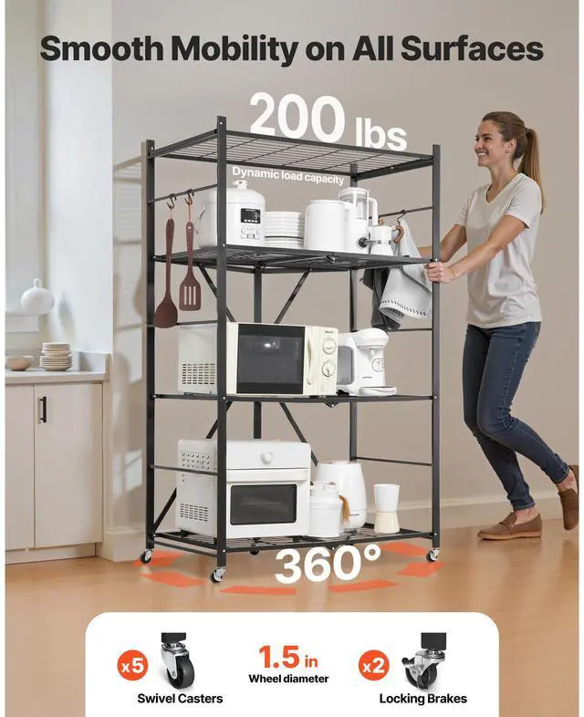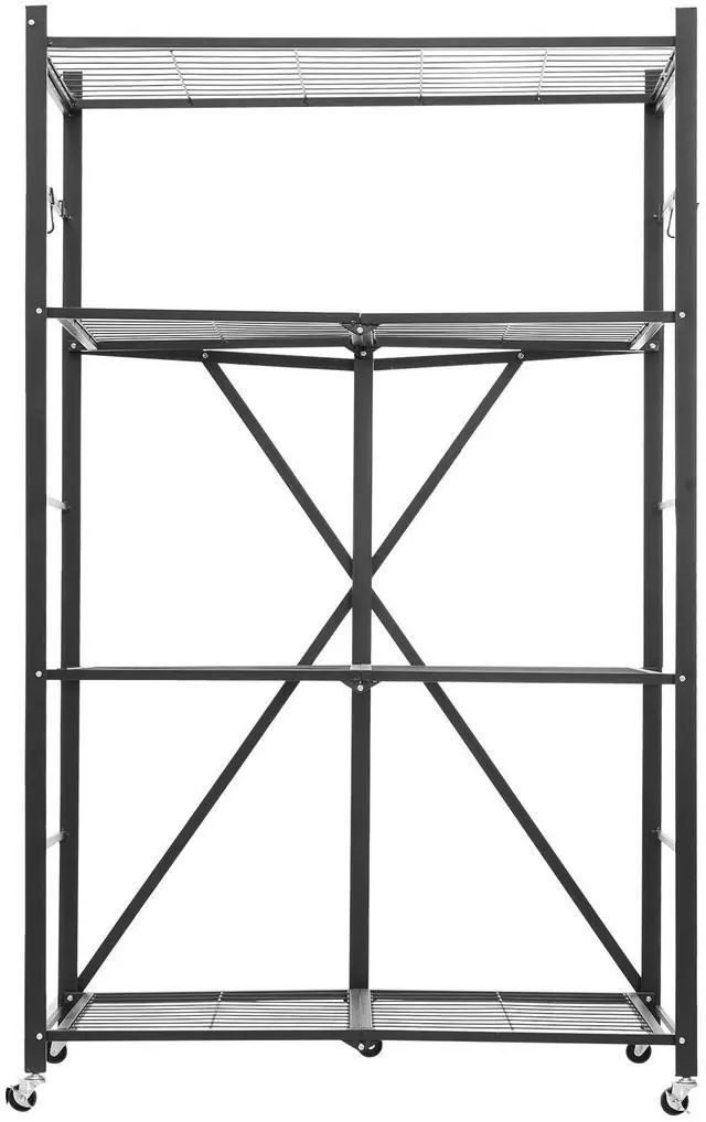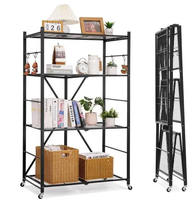 VEVOR Folding Storage Shelf with Wheels 4-Tier No Assembly Organizer Shelf Black
