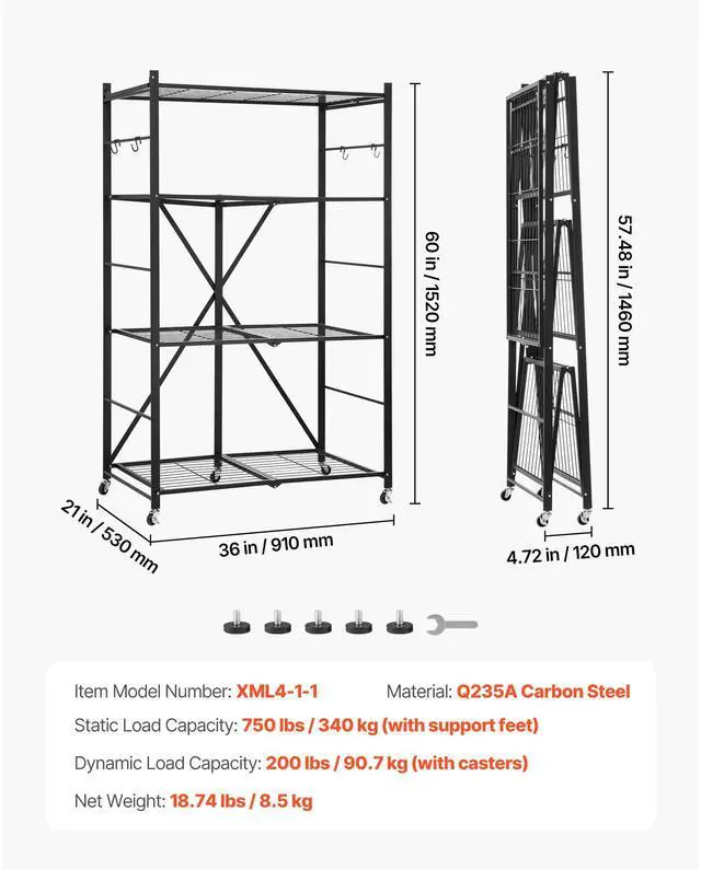 Static Load Capacity: 750 lbs / 340 kg (with support feet),Item Model Number: XML4-1-1,Dimensions: 21 x 36 x 60 in / 530 x 910 x 1520 mm (expanded with casters),Material: Q235A Carbon Steel,Dynamic Load Capacity: 200 lbs / 90.7 kg (with casters),Net Weight: 18.74 lbs / 8.5 kg
