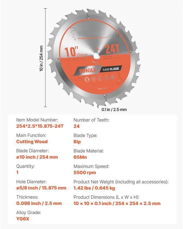 Blade Diameter: 10 inch / 254 mm,Thickness: 0.098 inch / 2.5 mm,Blade Material: 65Mn,Number of Teeth: 24,Blade Type: Rip,Main Function: Cutting Wood,Maximum Speed: 5500 rpm,Item Model Number: 254*2.5*15.875-24T,Quantity: 1,Hole Diameter: 5/8 inch / 15.875 mm,Product Dimensions (L x W x H): 10.00 x 10.00 x 0.10 inch / 254 x 254 x 2.5 mm,Product Net Weight (including all accessories): 1.42 lbs / 0.645 kg