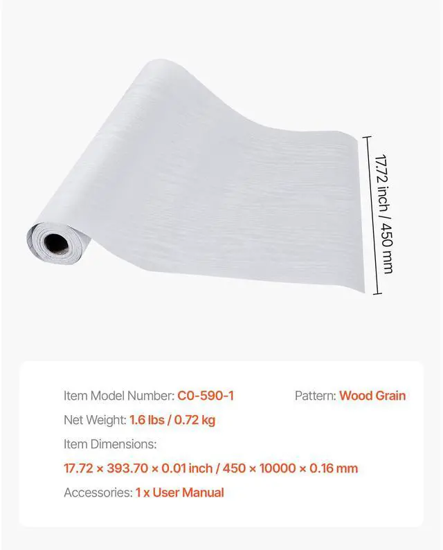 Pattern: Wood Grain,Roll Size (W x L): 17.72 x 393.7 inch / 45cm x 10m,Color: White,Item Model Number: C0-590-1,Item Dimensions: 17.72 x 393.70 x 0.01 inch / 450 x 10000 x 0.16 mm,Net Weight: 1.6 lbs / 0.72 kg,Main Material: PVC