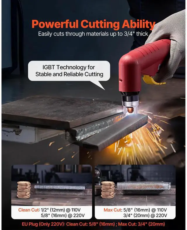 Output Current Range: 110V: 2052A ; 220V: 2065A,IGBT Technology: Yes,Input Voltage: Dual Voltage (AC 110V/220V),Product Dimensions: 14.4 x 7.5 x 11.4 in / 367 x 190 x 290 mm,Type: Non-Contact Plasma Cutter,Clean Cut Capacity: 1/2" (12 mm) @ 110V ; 5/8" (16 mm) @ 220V,Max Cut Capacity: 5/8" (16 mm) @ 110V ; 3/4" (20 mm) @ 220V,Adjustable PT Time: Yes,Item Model Number: CUT-65,Product Weight: 19.2 lbs / 8.7 kg,Frequency Type: Non-High Frequency,2T/4T Function: Yes,Input Current: 110V: 51A ; 220V: 32A