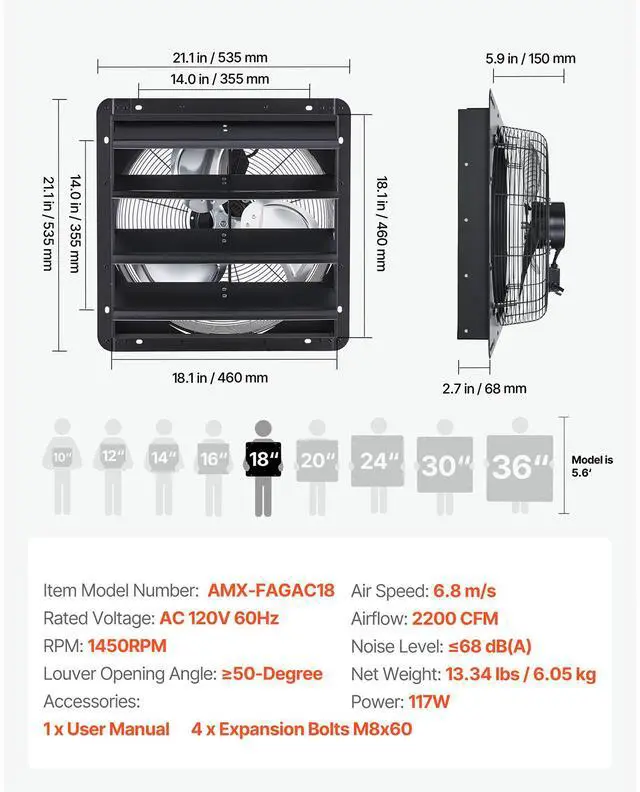 Airflow: 2200 CFM,Noise Level: 68 dB(A),Air Speed: 6.8 m/s,Temperature Rise: 70K,Item Model Number: AMX-FAGAC18,Item Dimensions: 21.06 x 21.06 x 8.58 in / 535 x 535 x 218 mm,Louver Opening Angle: 50-Degree,Net Weight: 13.34 lbs / 6.05 kg,Power: 117W,RPM: 1450 RPM,Main Material: Q235B Carbon Steel,Rated Voltage: AC 120V 60Hz