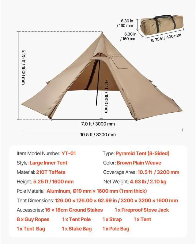 Type: Pyramid Tent (8-Sided),Tent Dimensions: 3200 × 3200 × 1600 mm / 126.00 × 126.00 × 62.99 in,Pole Material: Aluminum, Ø19 mm × 1600 mm (1 mm thick),Color: Brown Plain Weave,Item Model Number: YT-01,Style: Large Inner Tent,Material: 210T Taffeta,Height: 1600 mm / 5.25 ft,Coverage Area: 3.2 m / 10.5 ft,Net Weight: 2.10 kg / 4.63 lb
