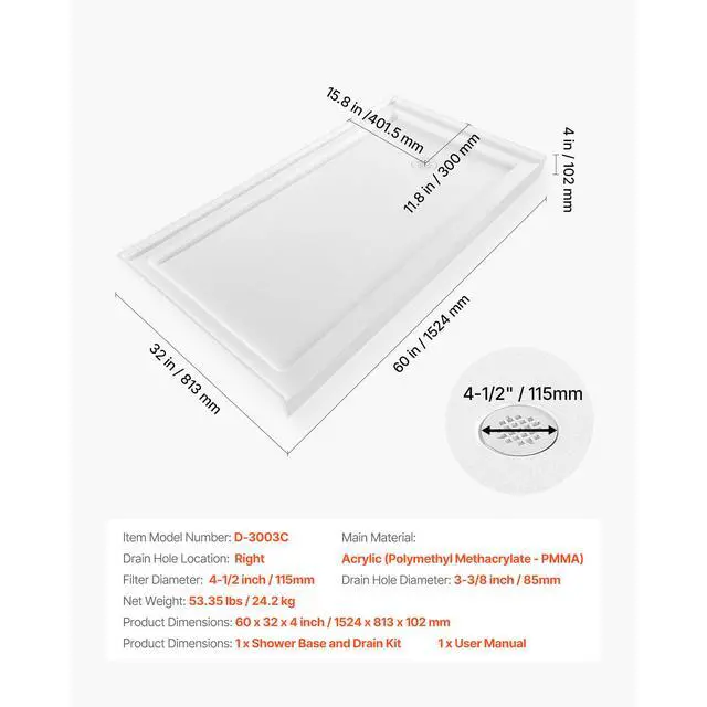 Drain Hole Location: Right,Drain Hole Diameter: 3-3/8 inch / 85mm,Item Model Number: D-3003C,Filter Diameter: 4-1/2 inch / 115mm,Product Dimensions: 60.00 x 32.00 x 4.00 inch / 1524 x 813 x 102 mm,Net Weight: 53.35 lbs / 24.2 kg,Main Material: Acrylic (Polymethyl Methacrylate - PMMA)