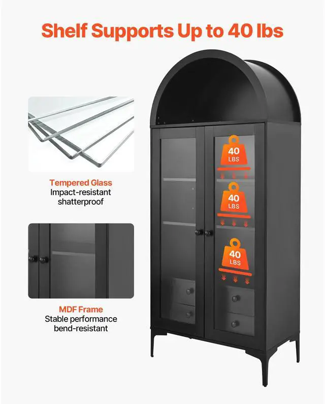 Type: Footed High Arched Cabinet,Door Material: 0.20 inch / 5 mm Glass,Materials: MDF, Glass,Shelves: 2 Adjustable Shelves, 1 Fixed Shelf,Item Model Number: WC1015,Max Load per Shelf: 40 lbs,Cabinet Leg Clearance: 6.69 inch / 170 mm,Product Dimensions: 31.50 × 15.75 × 70.47 inch / 800 × 400 × 1790 mm,Net Weight: 101.63 lbs / 46.10 kg,Power: No